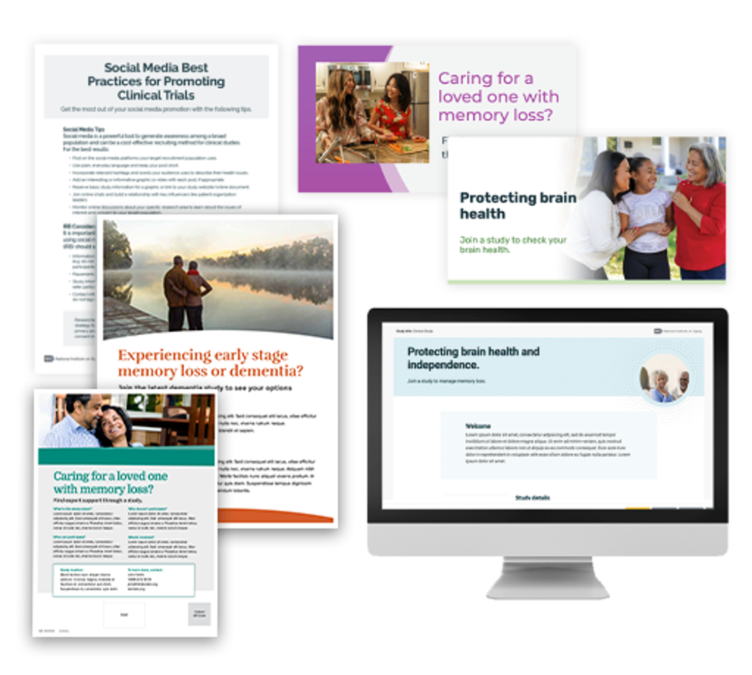 Customize professionally designed and audience tested educational materials about clinical studies on Alzheimer's disease and related dementias. Select the types of materials you need and enter your study specifics. Build materials in multiple languages and at no cost to you. You can create: